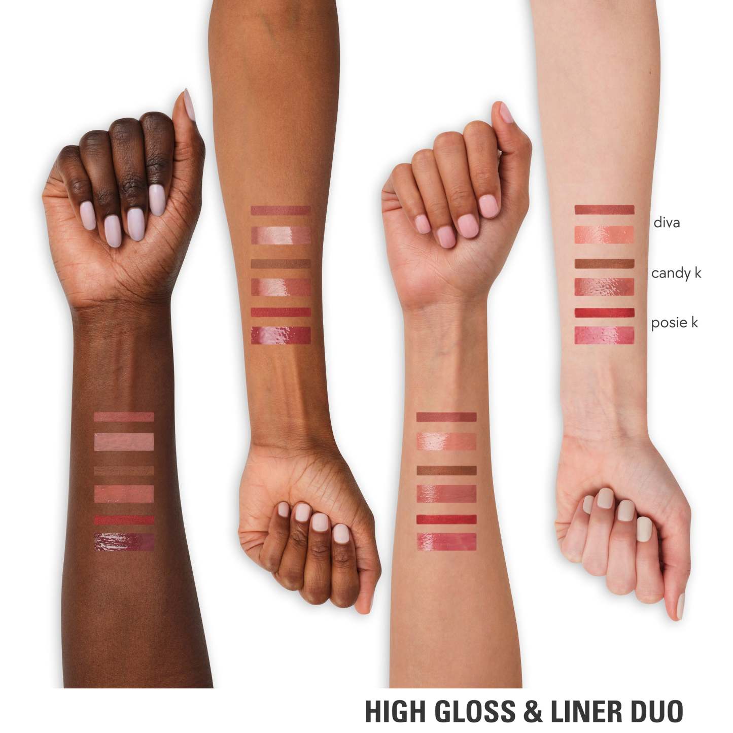 Get a defined glossy lip with my High Gloss and Liner Duo available in my best-selling shades. First, create a precise contour with the ultra-creamy, up to 24-hour wear Lip Liner pencil. Next, for multidimensional shine and color, swipe on High Gloss that leaves a luminous, comfortable finish without any stickiness.