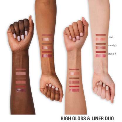 each duo includes the following shades:- Candy K High Gloss (warm pink nude) with Iced Latte Lip Liner (warm brown)