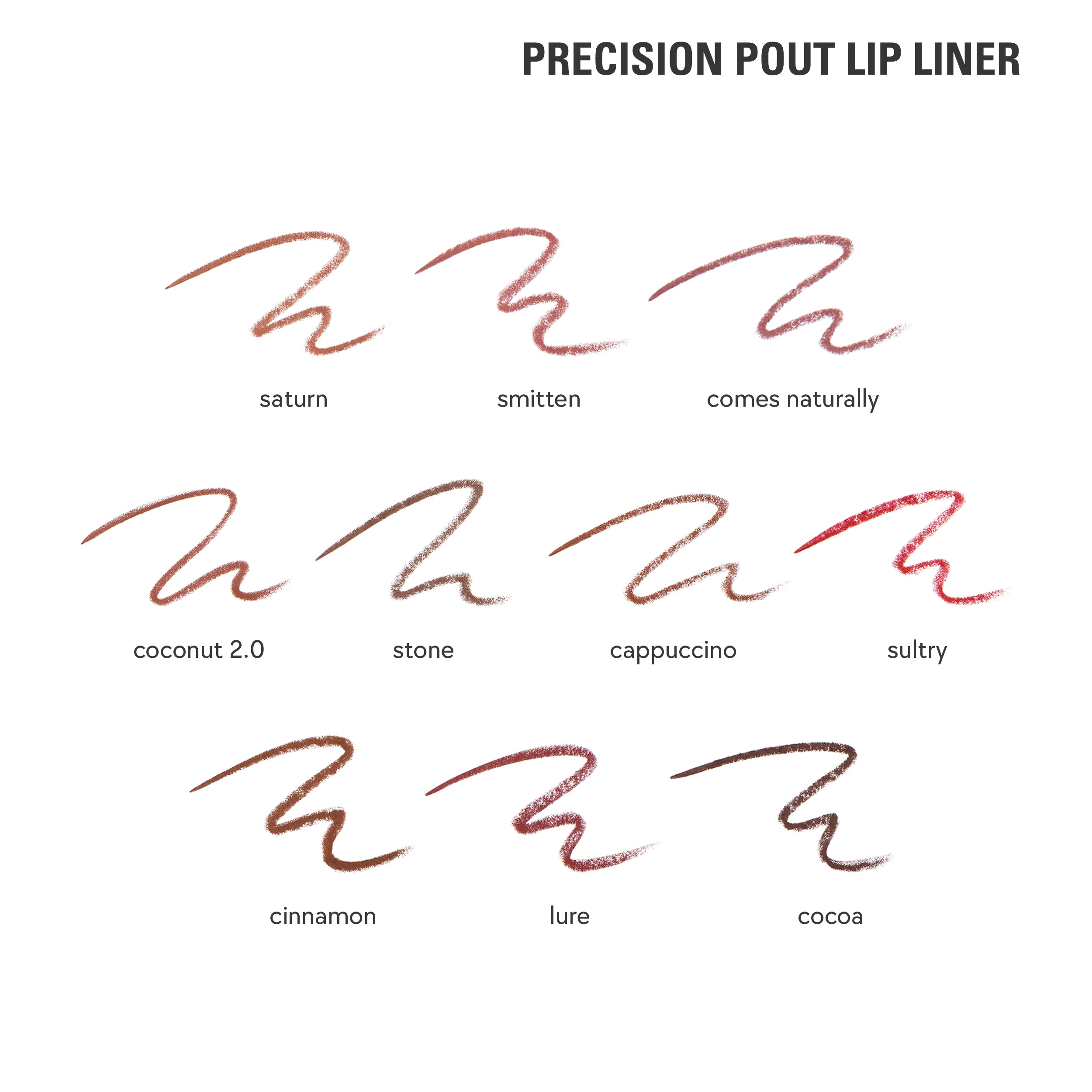 comes naturally precision pout lip liner (size: 0.04 oz) c10-18 triglycerides, mica, hydrogenated vegetable oil, caprylic/capric triglyceride, tocopherol, ascorbyl palmitate, [+/-: iron oxides (ci 77491, ci 77492, ci 77499), titanium dioxide (ci 77891), red 30 (ci 73360), red 7 (ci 15850), red 7 lake (ci 15850), yellow 5 lake (ci 19140)].